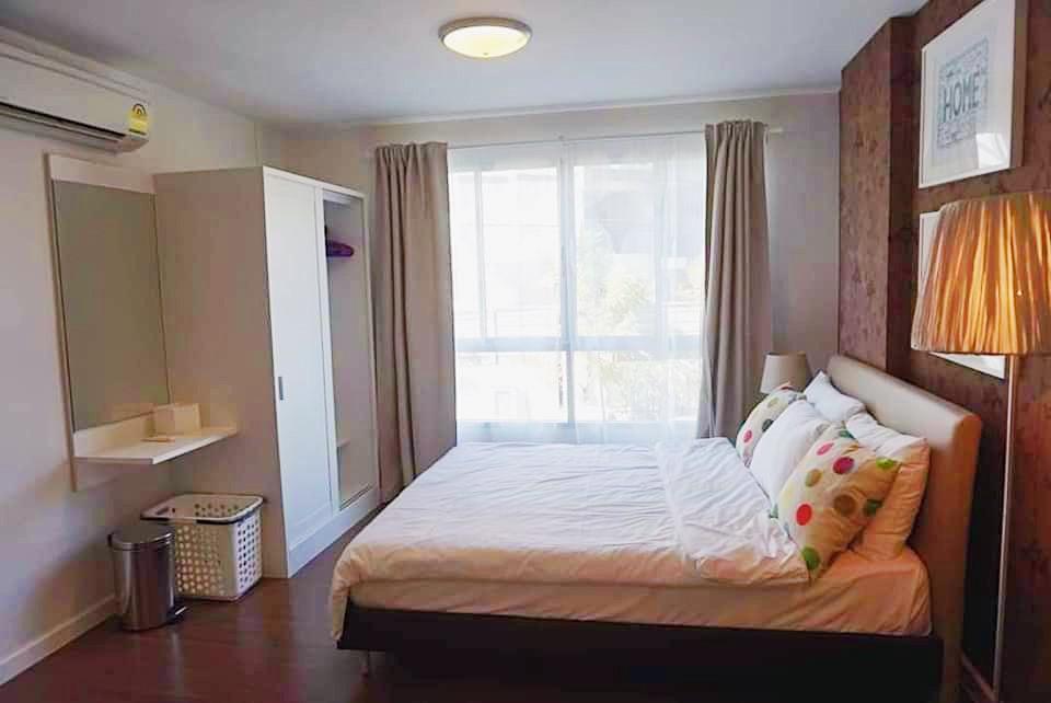 เตียง, ตู้เสื้อผ้า, โต๊ะทานอาหาร, โต๊ะเครื่องแป้ง, ชั้นวางทีวี, ทีวี, ตู้เย็น, เตาไฟฟ้า, ไมโครเวฟ, แอร์, เครื่องทำน้ำอุ่น
