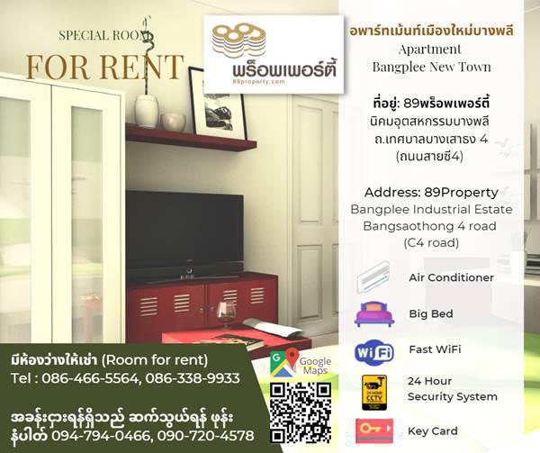 มีห้องว่างให้เช่า 89พร็อพเพอร์ตี้ อพาร์ทเม้นท์ เมืองใหม่ บางพลี อยู่ในแหล่งชุมชนที่เจริญมากๆ