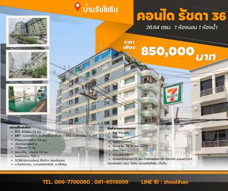 ขายคอนโดรัชดา 36 ขนาด 26.64 ตรม. 1 ห้องนอน 1 ห้องน้ำ