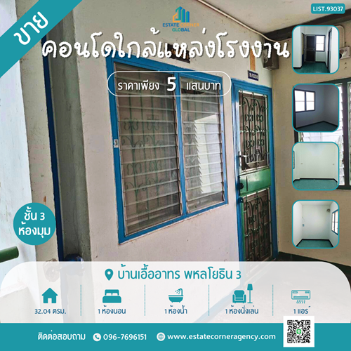 ขายด่วน! คอนโดบ้านเอื้ออาทร พหลโยธิน 3 ห้องมุม ชั้น 3 ทำเลดี เดินทางสะดวก ใกล้ตลาดไท-นิคมนวนคร