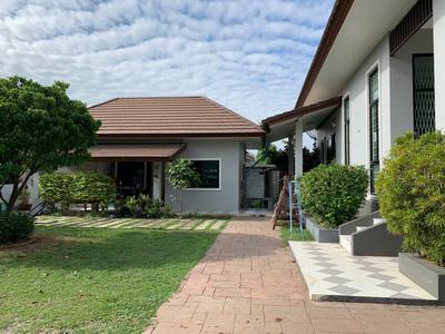 บ้านชั้นเดียวพร้อมที่ดิน เนื้อที่ 3 ไร่ พื้นที่กว้างขวาง บรรยากาศเงียบสงบ บ้านใหญ่ 3 ห้องนอน, 3 ห้องน้ำ, 1 ห้องทำงาน, 1 living room แบบ openconcept ครัวฝรั่ง built-in, บ้านใหญ่แอร์ 4 ตัว, 1 บ้านครัวไทยพร้อมห้องคนใช้และห้องน้ำ, 1 บ้านคนงานท้ายสวนมีแอร์ปั๊มน้้ำ ,อายุบ้าน 4 ปี พื้นที่ใช้สอย 1,600 ตารางเมตร
