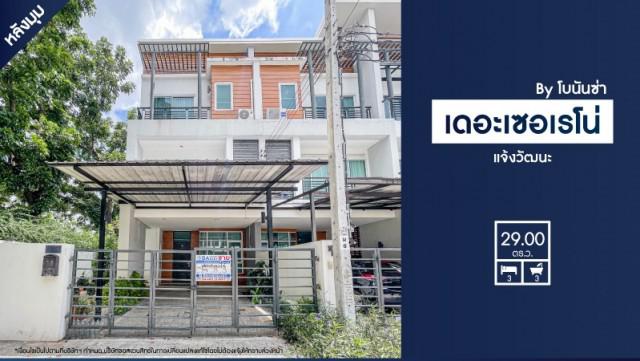 ขาย - ทาวน์เฮ้าส์มือสองย่านกรุงเทพฯ ม.เดอะเซอเรโน่ บาย โบนันซ่า แจ้งวัฒนะ หลังมุม บรรยากาศดี เนื้อที่กว้างขวางมากถึง 29 ตร.ว. ภายในสวย ฟังก์ชัน 3 ห้องนอน 3 ห้องน้ำ ที่จอดรถ 1 คัน บ้านสไตล์โมเดิร์น บนทำเลแห่งการเดินทาง ใกล้รถไฟฟ้าสายสีชมพู และจุดขึ้นทางด่วน "แจ้งวัฒนะ"