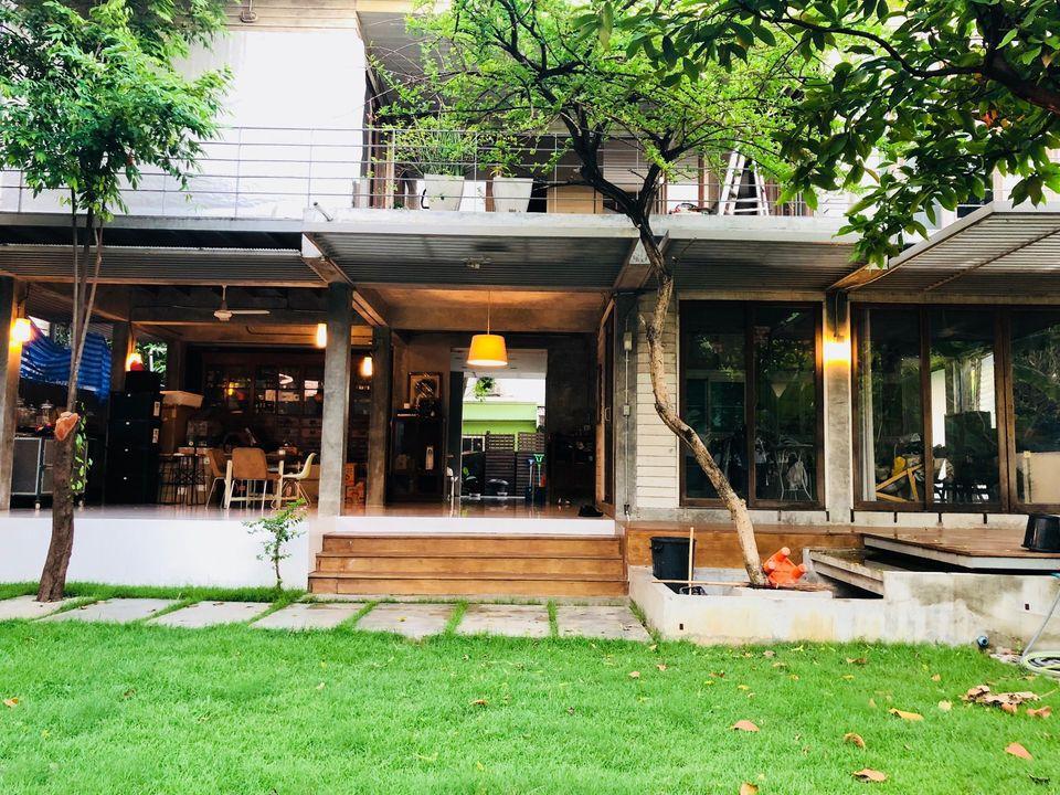 บ้านด้านหลังเป็นบ้านไม้ มีสนามหญ้า