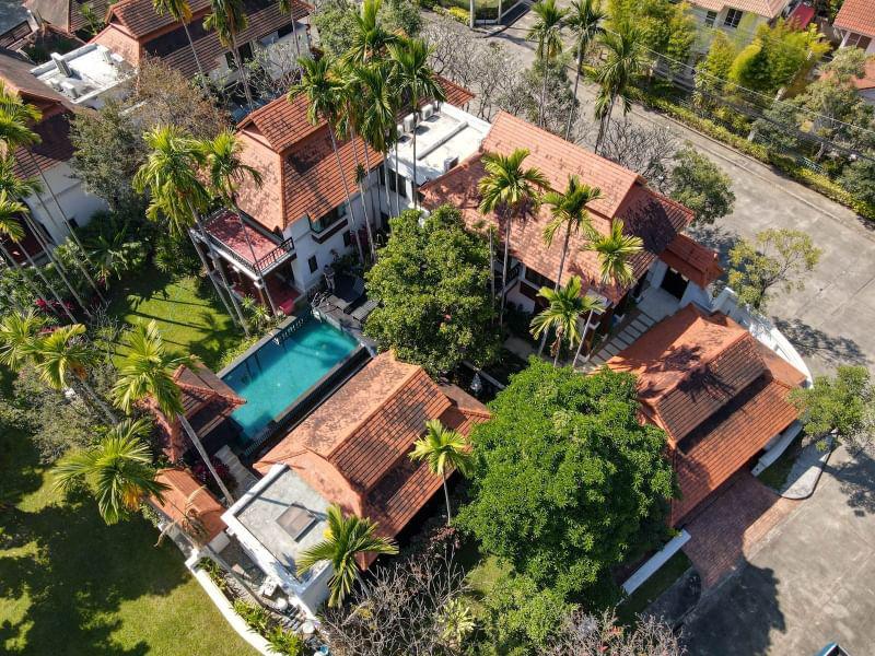 Luxury 4 bedroom pool villa in the Siwalee Klongchon Development. The property is located on a small island of green admist the development along with four other luxury homes and bordered by a small park. The house has a high privacy fence encircling the gardens, large covered Sala with attached western kitchen, elevated, two-level pool, and decks. There is direct access to the pool from both levels of the two-story house. The first level of the house has a lounge, dining area/serving kitchen, two bedrooms both with en-suite bathrooms, and a guest toilet. The second floor has a large deck, lounge and master and guest bedrooms. The master bedroom has a huge en-suite bathroom with jacuzzi tub with sliding partitions that open up onto the main bedroom. There is also a private balcony and walk-in closet. High-end touches including name brand appliances, hard-wood floors and built-in furniture, and teak door, windows, and frames are used throughout the house.