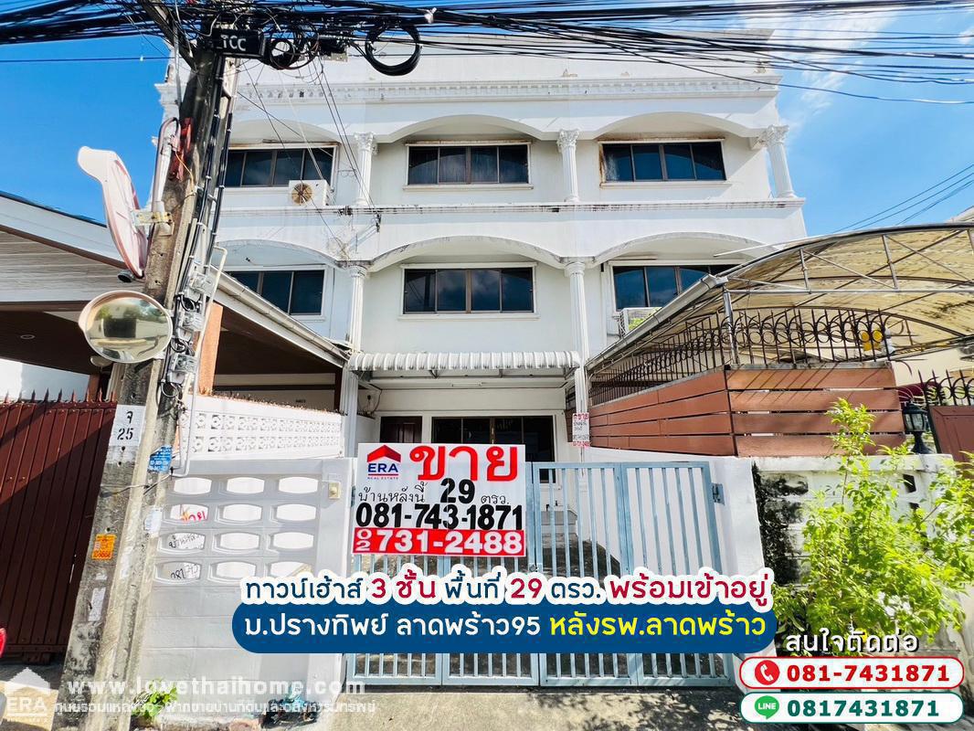 ขายทาวน์เฮ้าส์ 3 ชั้น ลาดพร้าว95 หมู่บ้านปรางทิพย์ หลังรพ.ลาดพร้าว ใกล้ MRT สถานีมหาดไทย พื้นที่ 29 ตรว.บ้านพร้อมอยู่