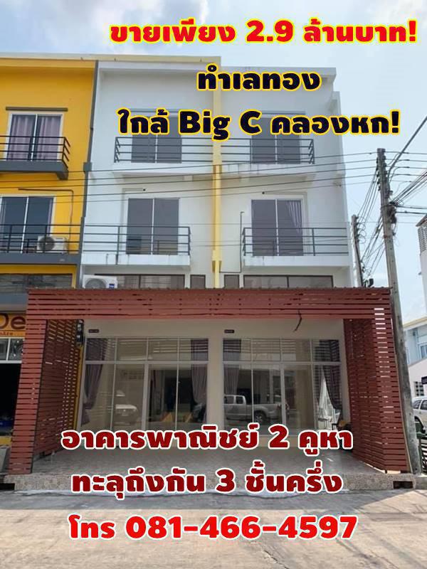 ขายเพียง 2.9 ล้านบาท! อาคารพาณิชย์ 2 คูหา ทะลุถึงกัน 3 ชั้นครึ่ง ห้องหัวมุม สภาพใหม่ ทำเลทอง ใกล้ Big C คลองหก! โทร 081-