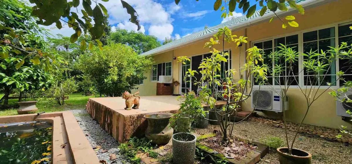 # บรรยากาศและสิ่งแวดล้อม บ้านร่มรื่น เงียบสงบ น้ำไม่ท่วม ด้านหลังที่ดินติดคลอง ไม่มีบ้านติดกัน เป็นส่วนตัวและเงียบสงบ ภายในสวนปลูก ผลไม้นานาชนิด
