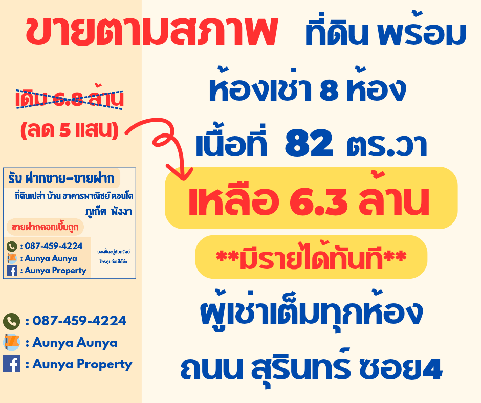ประกาศที่ท่านเห็นอยู่นี้เป็นประกาศที่ผู้ต้องการซื้อขาย (อาจเป็นเจ้าของหรือนายหน้า) ได้นำเนื้อหาและรูปภาพมาลงไว้ด้วยตนเอง กรุณาตรวจสอบข้อมูลผู้ซื้อขาย และตรวจสอบอสังหาริมทรัพย์ก่อนทำการซื้อขายจริง ข้อมูล/รูปภาพผู้ประกาศจะรับผิดชอบทั้งหมด