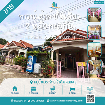 ขาย ทาวน์เฮ้าท์ ชั้นเดียว 2 หลังทะลุเป็นหลังเดียว มีดาดฟ้า ไว้ชมวิวหรือนั่งพักผ่อน หมู่บ้านวรารักษ์ รังสิต - คลองสาม คลอ