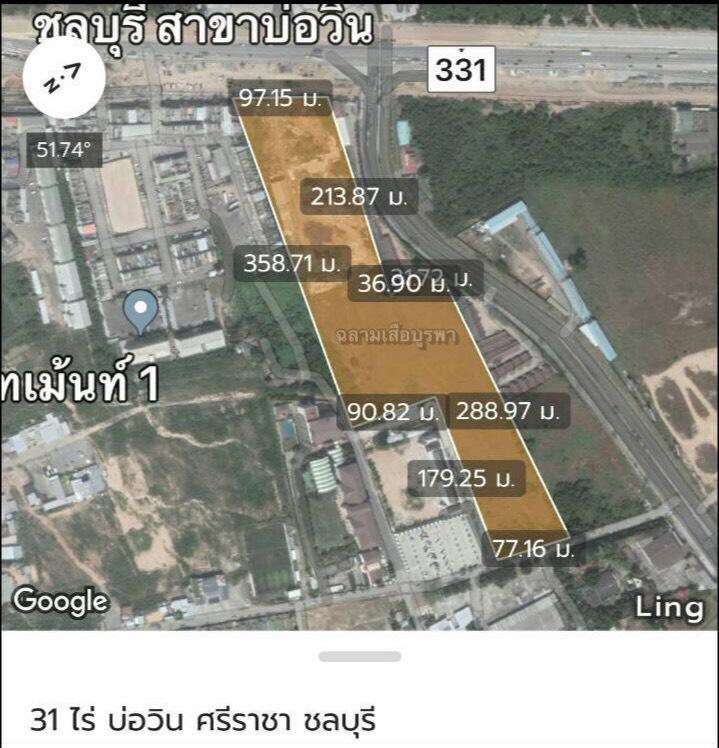 ด่วนขายที่ดิน 31 ไร่ ตั้งอยู่ติดถนนทางหลวงยุทธศาสตร์ สัตหีบ-พนมสารคาม(เส้น331) ต.บ่อวิน อ.ศรีราชา จ.ชลบุรี ที่ดินแปลงนี้ตั้งอยู่ในทำเลที่ดีมีศักยภาพสูงมาก อยู่ใกล้สี่แยกปากร่วม เยื้องกับที่ดินของห้างโรบินสัน ที่ดินแปลงนี้ติดถนน3 ด้าน คือด้านหน้าติดถนนเส้น 331ยาวประมาณ97เมตร ด้านข้างติดถนนทางเข้า-ออกของนิคมอีสเทิร์นซีบอร์ด ด้านหลังติดถนนซอยเข้า-ออกของโรงเรียนปัญญานฤมิตร พท.ผังสีม่วงลาย
