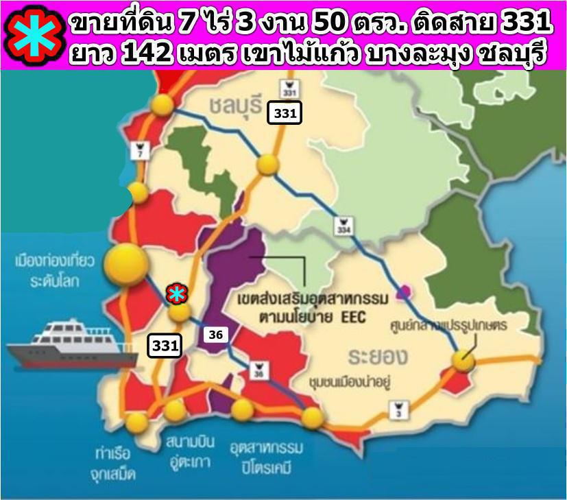 ** ขายที่ดิน 7 ไร่ 3 งาน 50 วา ติดสาย 331 ยาว 142 เมตร ต.เขาไม้แก้ว อ.บางละมุง จ.ชลบุรี ห่างจากสี่แยกเขาไม้แก้ว 1 กม. **
