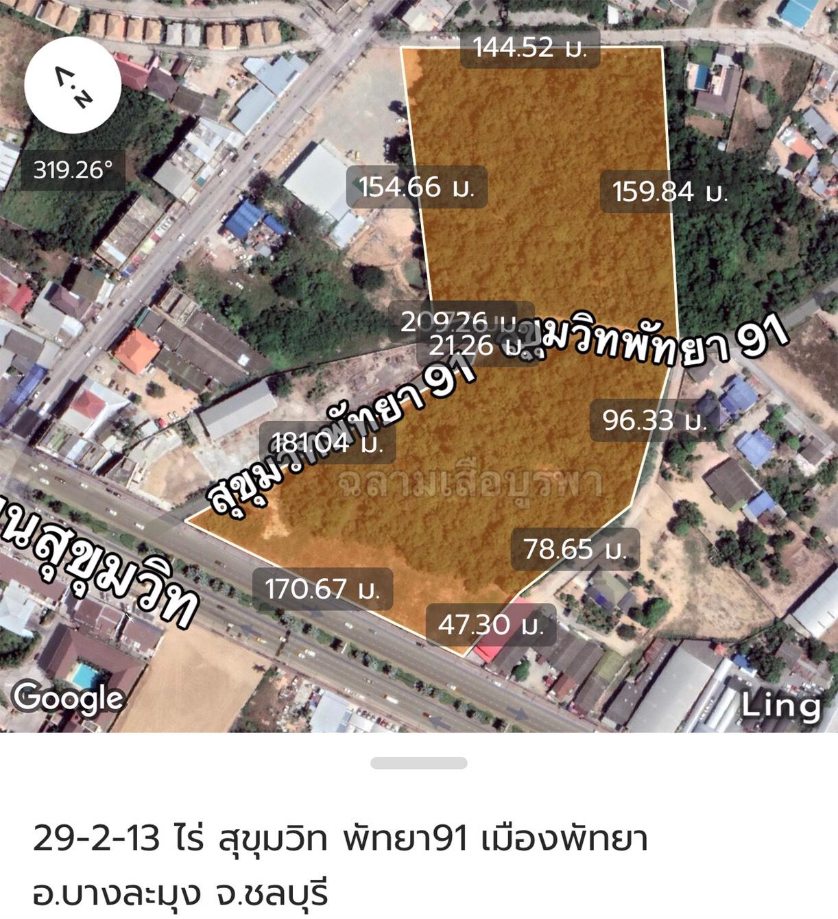 ขายที่ดิน 29-2-13 ไร่ ตั้งอยู่เมืองพัทยา อ.บางละมุง จ.ชลบุรี ด้านหน้าที่ดินติดถนนสุขุมวิทกว้าง 170 เมตร ด้านข้างติดถนนซอยสุขุมวิทพัทยา91(ถนนซอยผ่ากลางที่ดิน ทำให้ที่ดินถูกแบ่งเป็น2แปลง) และแปลงด้านหลังยังติดถนนทางสาธารณะประโยชน์อีกด้วย ที่ดินอยู่ในผังเมืองสีแดงสามารถขึ้นอาคารสูงๆได้ อยู่ในแหล่งธุรกิจที่มีความเจริญสูงมาก