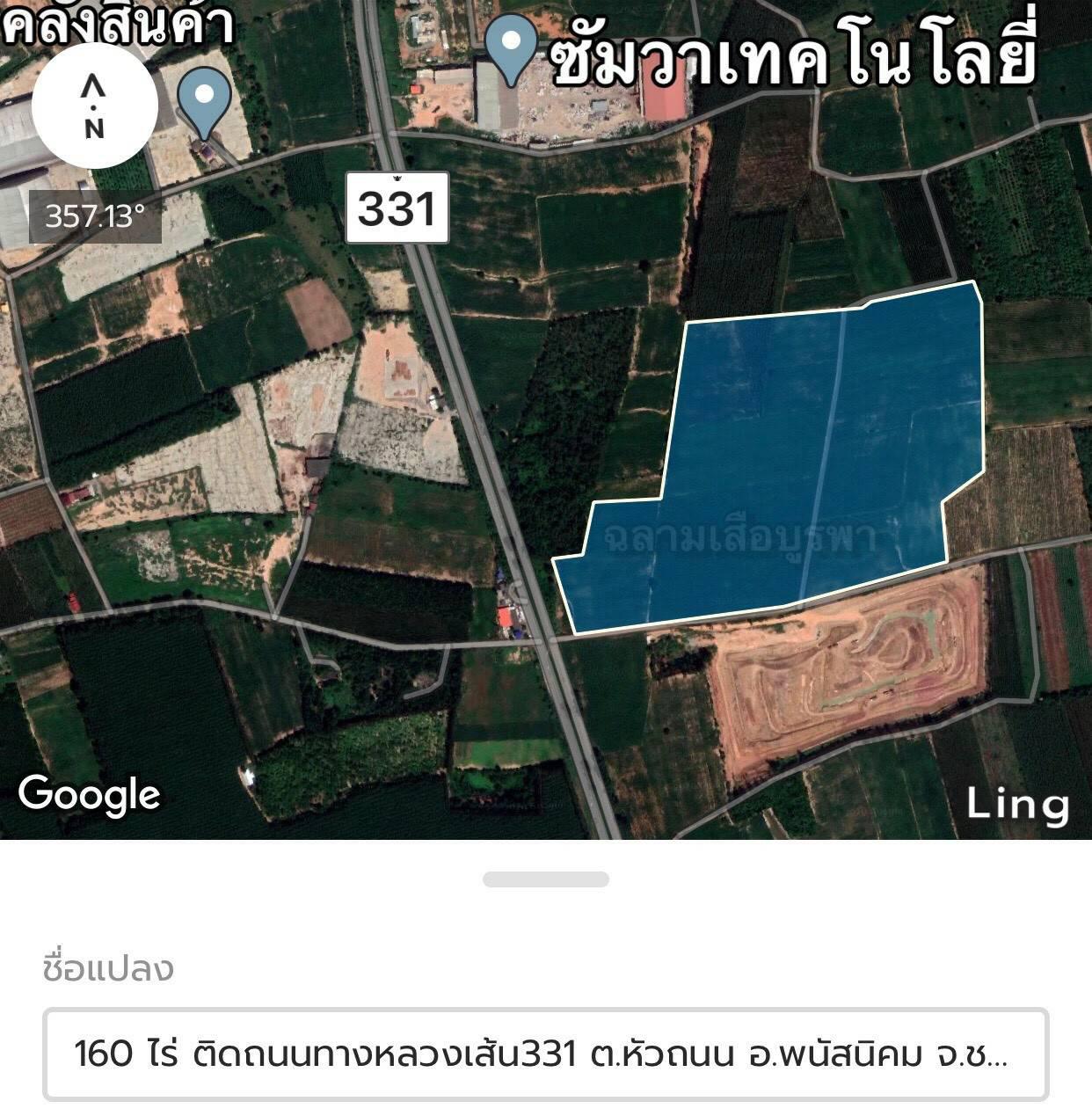 ขายที่ดินติดทางหลวงเส้น 331 ต.หัวถนน อ.พนัสนิคม จ.ชลบุรี 160 ไร่ หน้ากว้างติดถ.4เลนส์ 128 ม. ด้านข้างติดถนนดำยาวประมาณ 615 ม.
