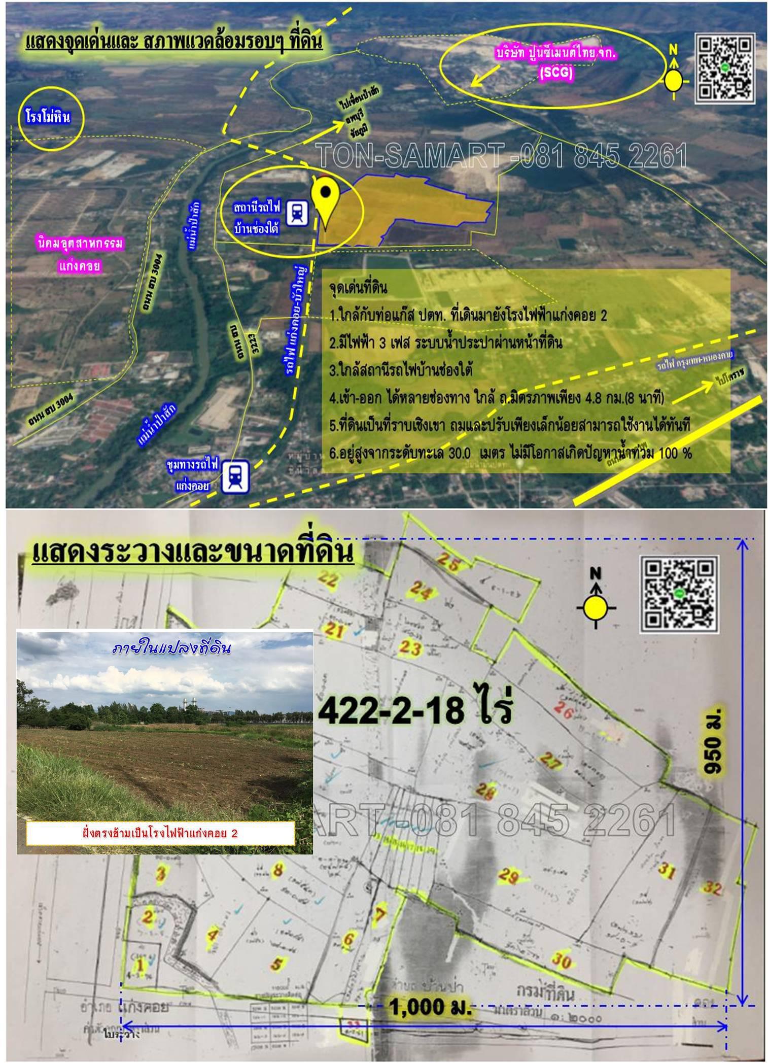 >>ขายที่ดินติดถนนเลียบทางรถไฟ 700 เมตร, อ.แก่งคอย จ.สระบุรี เนื้อที่ 422-2-18 ไร่