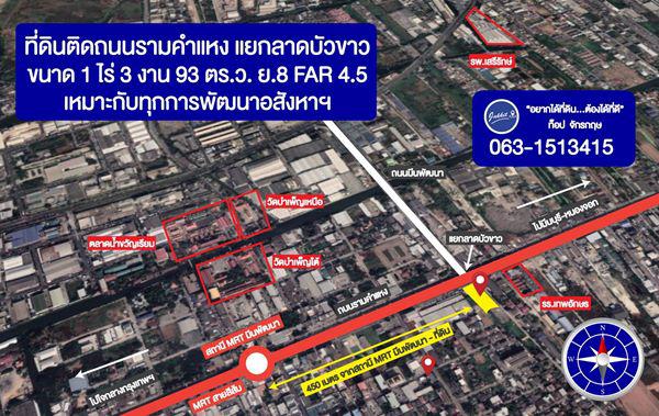 ขายที่ดิน1-3-93 ไร่ ติดถนนรามคำแหง แปลงมุมติดถนน2ด้าน ทำเลโซนพณิชย่านมีนบุรี ใกล้สถานีมีนพัฒนารถไฟฟ้าสายสีส้ม เหมาะกับการลงทุนพัฒนาอสังหาทุกประภท