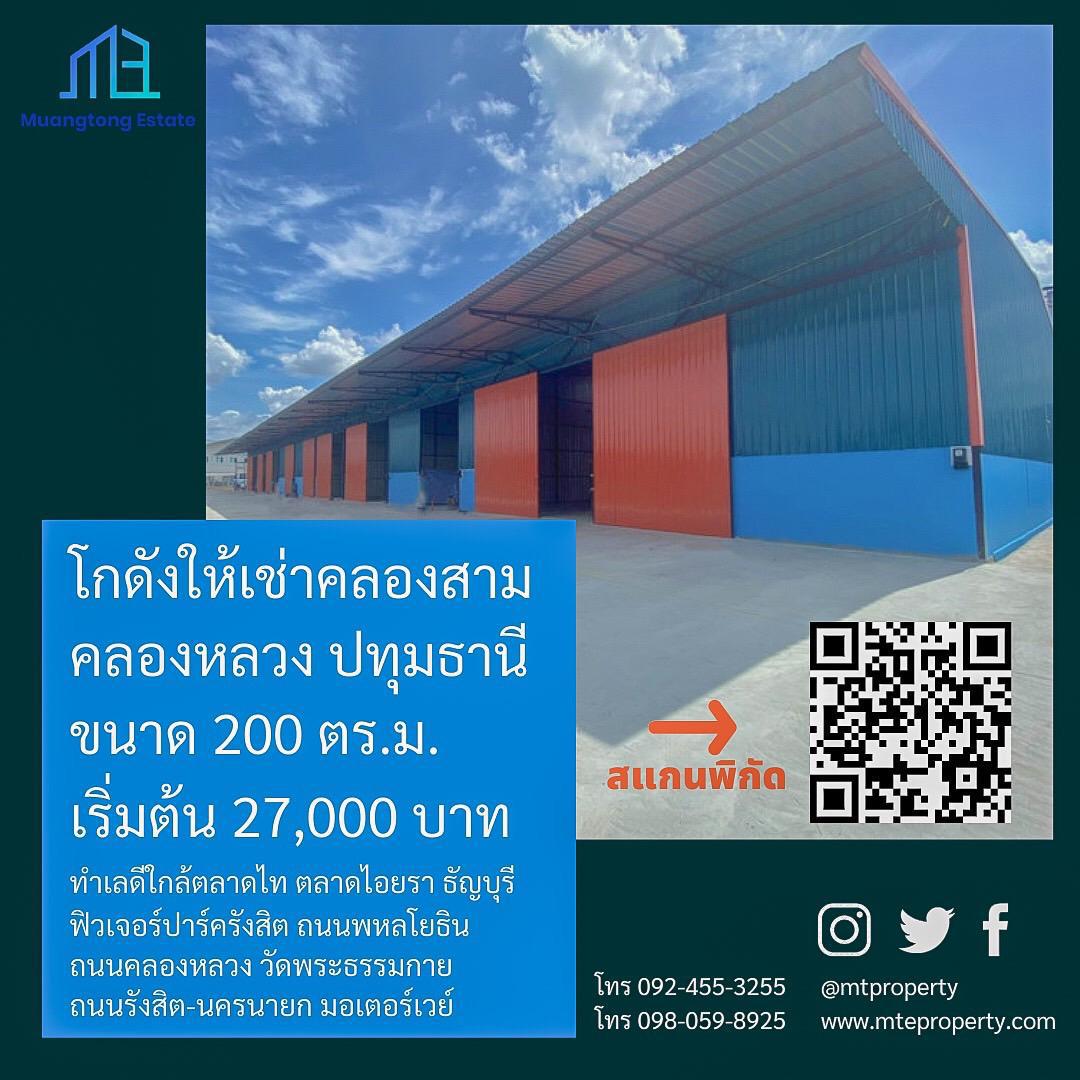 รหัสทรัพย์: MTK007 โกดังให้เช่า 200 - 250 ตรม. ย่านคลองสาม อ.คลองหลวง จ.ปทุมธานี รายละเอียด