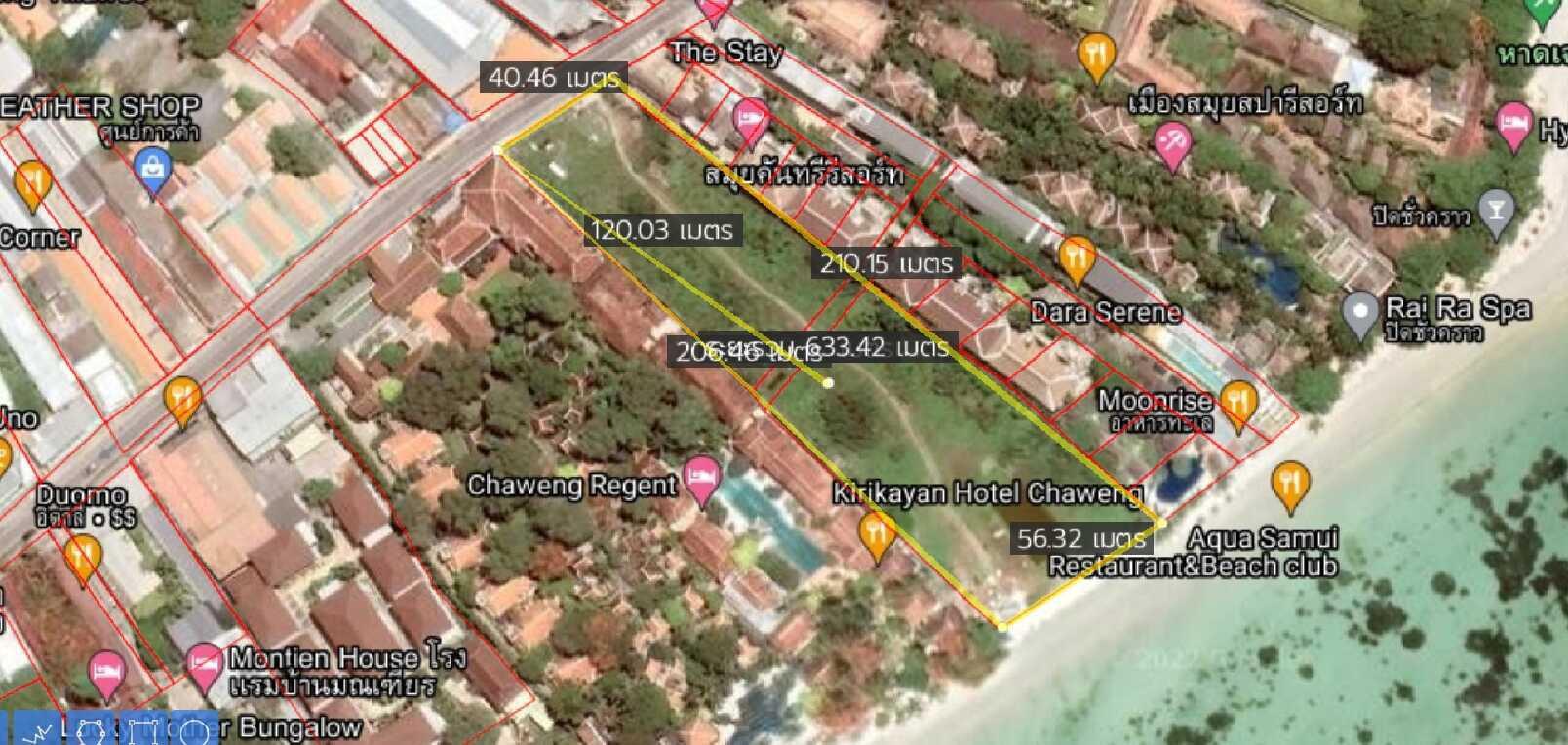 ขายที่ดินเปล่าติดหาดเฉวง เนื้อที่ 6-0-42 ไร่ ขายราคา 800 ล้านบาท ใกล้สนามบิน ห้างเซ็นทรัลสมุย ขนาดที่ดิน หน้ากว้าง 40 เมตร ลึก 210 เมตร หน้ากว้างติดหาดเฉวง 56 เมตร