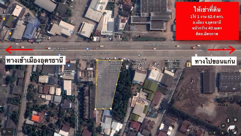 ที่ดินเปล่า ขนาด : 1 ไร่-1 งาน- 62.4 ตรว. หน้ากว้าง 40 เมตร สำหรับ ขาย/เช่า ติด ถนนมิตรภาพ ห่างจาก รพ.ค่ายประจักษ์ศิลปาคม เพียง 300 เมตร ฝั่งเดียวกันกับ กองบิน 23 และ มหาวิทยาลัยราชภัฏอุดรธานี เป็นทำเลที่ดินที่มีศักยภาพสูง สำหรับการลงทุน เนื่องจากภายในรัศมี 5 กม. เป็นที่ตั้งของสถานที่สำคัญมากมายของ จ.อุดรธานี ไม่ว่าจะเป็น วัด มหาวิทยาลัย ศูนย์กลางการค้า Central UD TOWN โรงพยาบาลรัฐ-เอกชน โรงแรม คอนโด โรงเรียน ตลาด การคมนาคมสะดวก ถนนหน้าที่ดินขนาด 6 เลน ตรงข้ามมี Show Room Nissan และ Kia Motor
