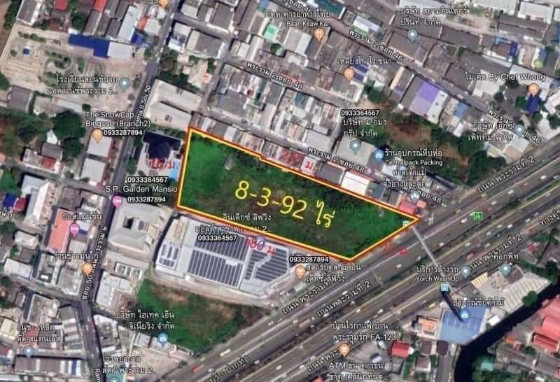 ขายที่ดิน 8 ไร่ 3 งาน 92 ตรว.อยู่ติดถนนพระราม 2 ฝั่งขาเข้า อยู่ระหว่างซอย พระราม 2 ซอย 48-50