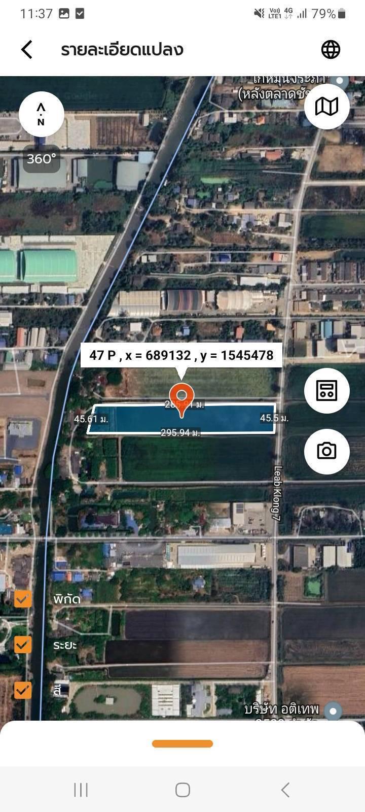 หน้ากว้างติดถนน 45 เมตร ลึก 295 เมตร ท้ายแปลงติดคลอง7 กว้าง 45 เมตร