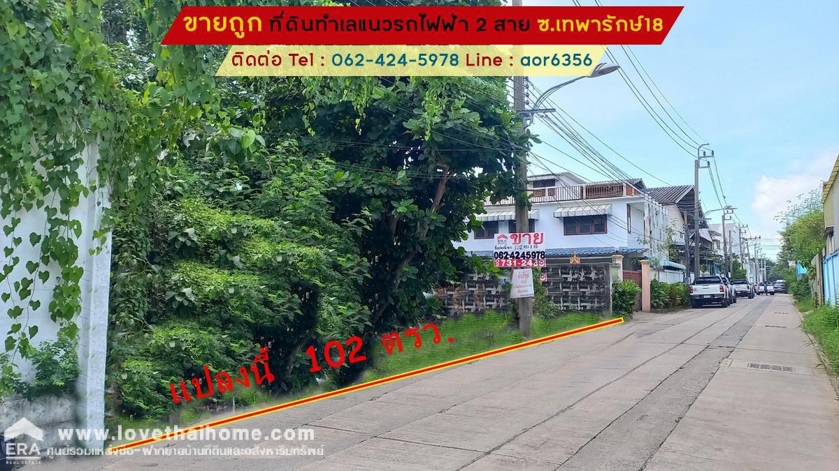 ขายที่ดิน ซอยเทพารักษ์18 สมุทรปราการ พื้นที่ 102 ตรว. ขายวาละ 55,000 บาท ทำเลแนวรถไฟฟ้า ใกล้ทั้ง BTS และ รถไฟฟ้าสายสีเหล