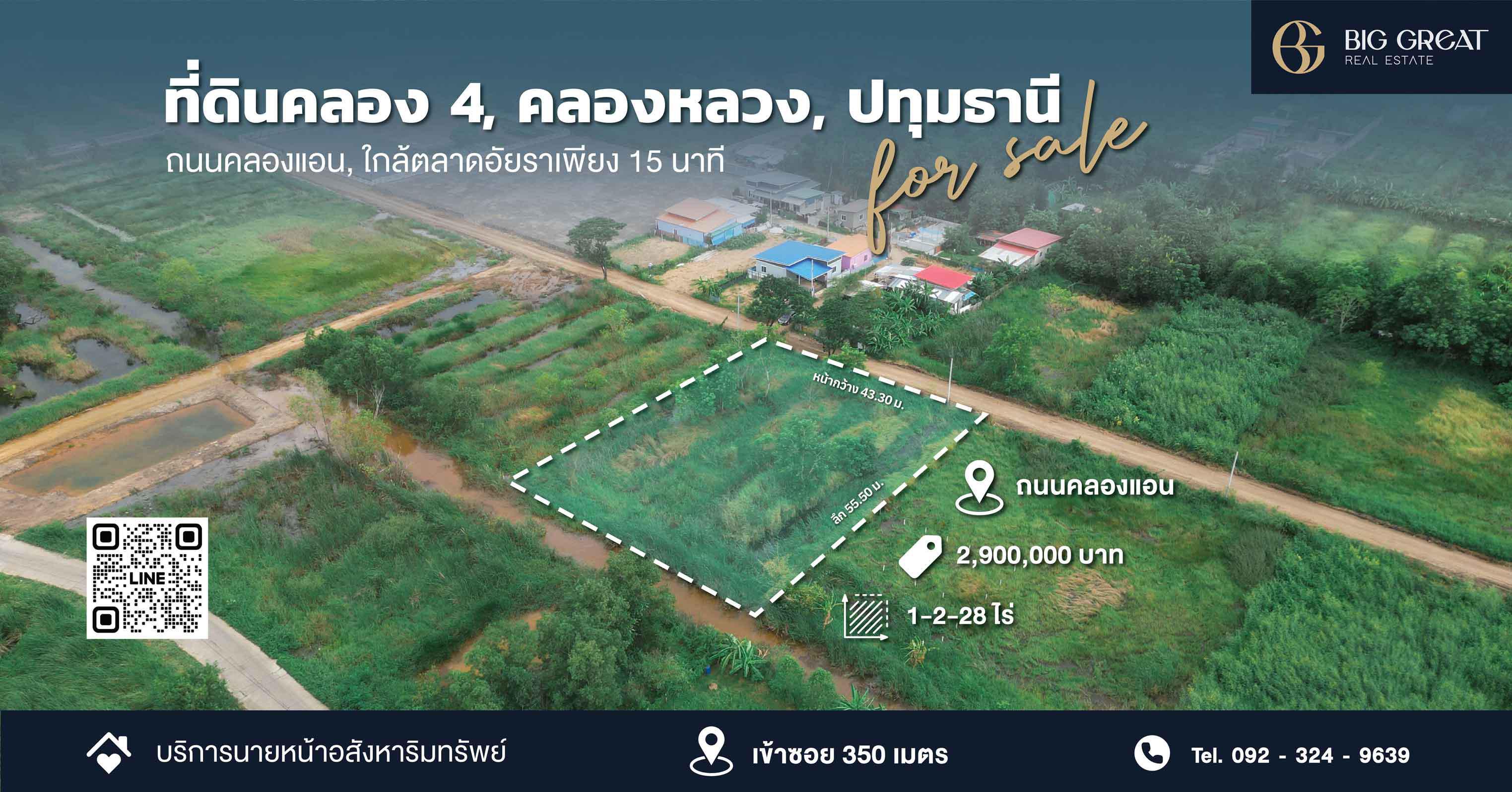 ขายที่ดินทำเลทอง คลองสี่ คลองหลวง ปทุมธานี ขนาด 1 ไร่ 2 งาน 28 ตร.ว. ราคาเพียง 2.7 ล้านบาท