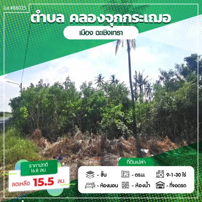 ขายที่ดินเปล่า เนื้อที่รวม 9 ไร่ 130 ตารางวา ติดถนนเลียบคลองจุกกระเฌอ ถนนเมนซอยเชื่อมไปวัดสมานรัตนาราม โฉนดรวม 2 แปลง