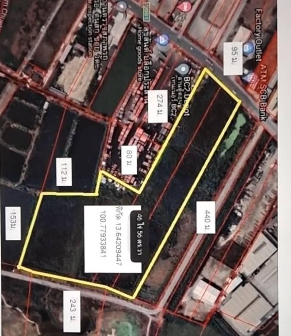 ที่ดินแปลงสวย 46 ไร่ 56 วา ติดถนนศรีวารีน้อย หน้ากว้าง 96 เมตร ลึก 442 เมตร ด้านหลังติดสนามกอร์ฟ เลควูด กว้าง 246 เมตร จาดถนนบางนาตราดมาถึงที่ดิน 4 กิโลเมตร ติดลานตู้ตอนเทนเนอร์ BC DEPOT 2 ด้านหลังติดสนามกอร์ฟ Lakewood เลควูด คันทรี่คลับ ,เลควูด คันทรี่คลับ ,ตรงข้ามหมู่บ้านนิรันดร์วิลล์12 ,ใกล้สนามบินสุวรรณภูมิ ,ใกล้มหาวิทยาลัยหัวเฉียว Thai Inter Depot and Transport Co.,Ltd (TID) ลานตู้ T.I.D & T.D.T ธ.ก.ส.สาขาบางเสาธง ,Thai Eng Kong Container Services Ltd (Bangkok) , International Laboratories Corporation Ltd or ILC ,โกดัง บริษัท อินเตอร์เนชั่นแนล แลบบอราทอรีส์ จำกัด , CMA CGM Inland Services (Thailand) Limited (CCIS3) – Bang Sao Thong ,คิงเพาเวอร์ ศรีวารี ,บจก. ไทยกลาสเทคโนโลยี ,บมจ. อุตสาหกรรมทำเครื่องแก้วไทย ,ตลาดธนาทรัพย์ ,