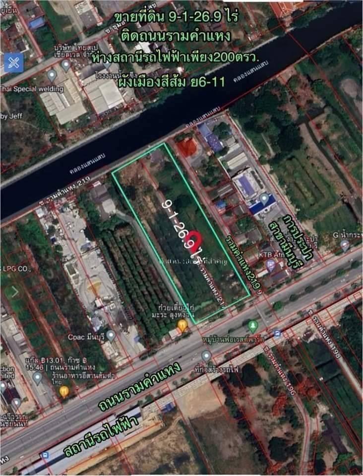 R624-036ขายที่รามคำแหง 9-1-26.9 ไร่ติดถนนรามคำแหงใกล้การประปาสาขามีนบุรี ห่างสถานีรถไฟฟ้าMRT ร่มเกล้า ประมาณ150-200เมตร ผังเมืองสีส้ม ย6-