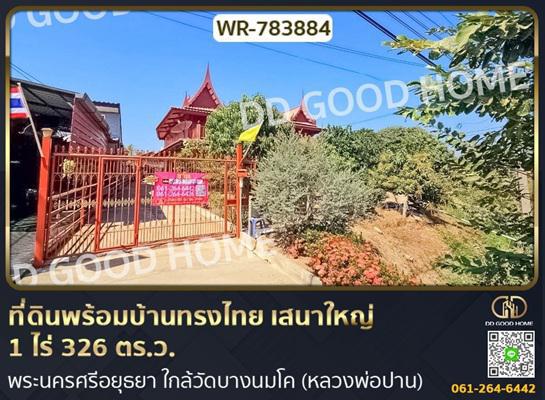 ที่ดินพร้อมบ้านทรงไทย บางบาล 1 ไร่ 326 ตร.ว. พระนครศรีอยุธยา ใกล้วัดบางนมโค (หลวงพ่อปาน)