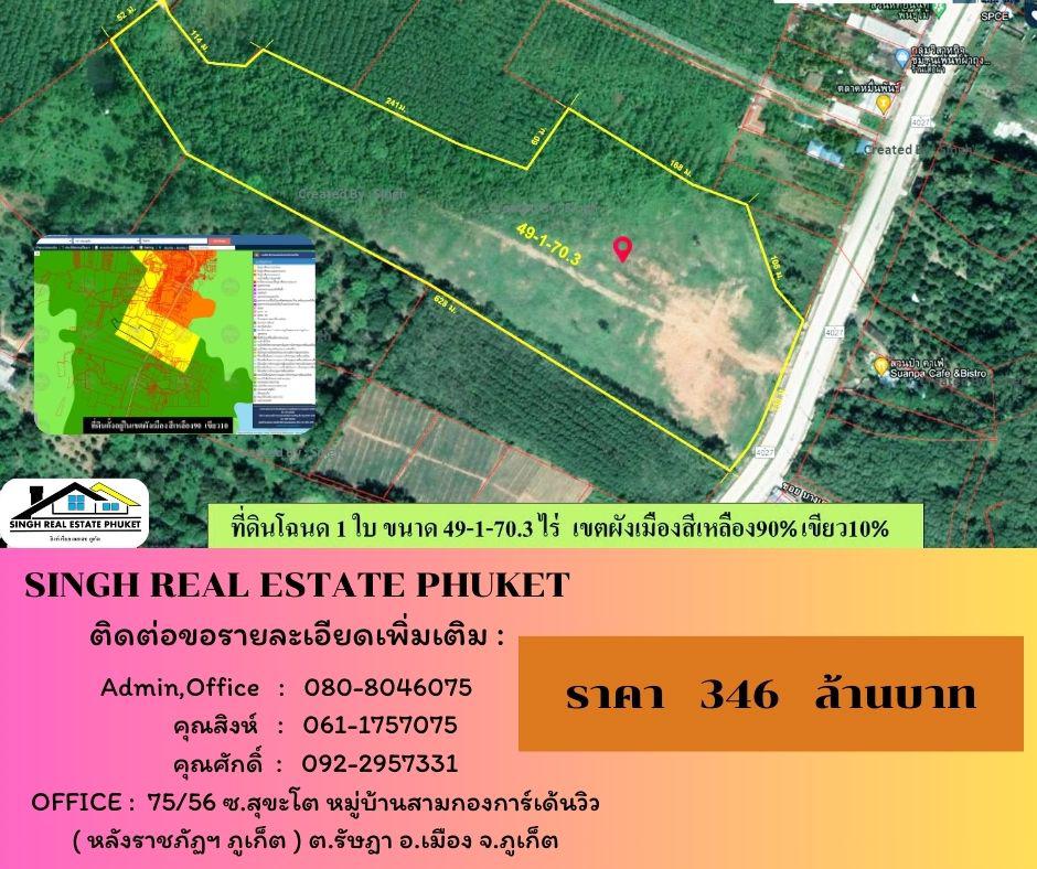 ที่ดินแปลงนี้อยู่ไปทางอนุสาวรีย์-ป่าคลอก โดยที่ดินมีหน้ากว้างติดถนนถึง128 เมตร และอยู่ห่างจากอนุสาวรีย์ไปทางป่าคลอกสายขาออกเพียง 9 กิโลเมตร สภาพแปลงที่ดินเป็นที่ราบโล่งไม่มีสิ่งปลูกสร้าง 90% ของที่ดินแปลงนี้ตั้งอยู่ใน ** เขตผังเมืองสีเหลือง ** ซึ่งทำให้สามารถพัฒนาเป็นโครงการจัดสรร โครงการบ้านวิลล่า บ้านเดี่ยว บ้านแฝดหรือทาวน์เฮ้าส์ ซึ่งถนน 4027 ในขณะนี้กำลังมีโครงการขยายถนนเป็น 4 เลน ซึ่งจะขยายตลอดทั้งสาย แปลงที่ดินมีศักยภาพที่จะรองรับการเติบโตของถนนสายนี้และรองรับการเติบโตของภูเก็ตที่จะเทมาทางป่าคลอก-บางโรง การเดินทางเข้า- ออกเมืองก็สะดวกสบาย และไม่ไกลจากแหล่งอำนวยความสะดวกต่างๆ ทุนพัฒนาท่านใดสนใจที่ดินแปลงนี้จะซื้อเพื่ออยู่หรือพัฒนา สามารถติดต่อขอรายละเอียดเพิ่มเติมได้ที่ สิงห์ เรียล เอสเตท ภูเก็ต