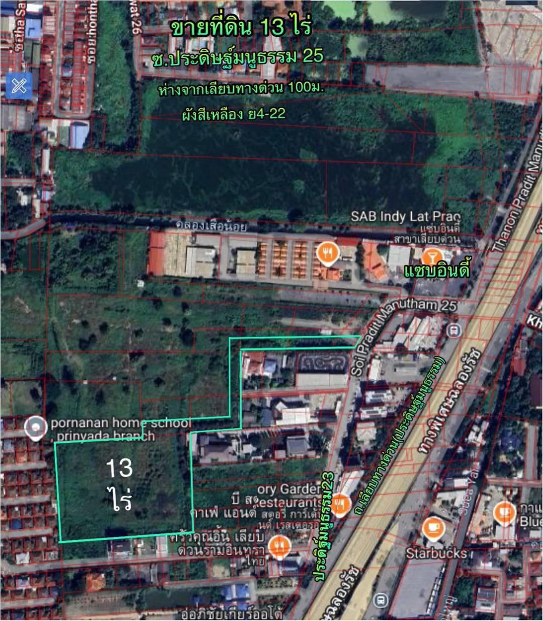 R68-077ขายที่ดิน 13 ไร่ติดถนนซอยประดิษฐ์มนูธรรม25 ห่างจากถนนประดิษฐ์มนูธรรม(เลียบทางด่วน)เพียง 100 เมตร ทำเลดีถนนซอยกว้าง 12 เมตร ใจกลางเลียบทางด่วน