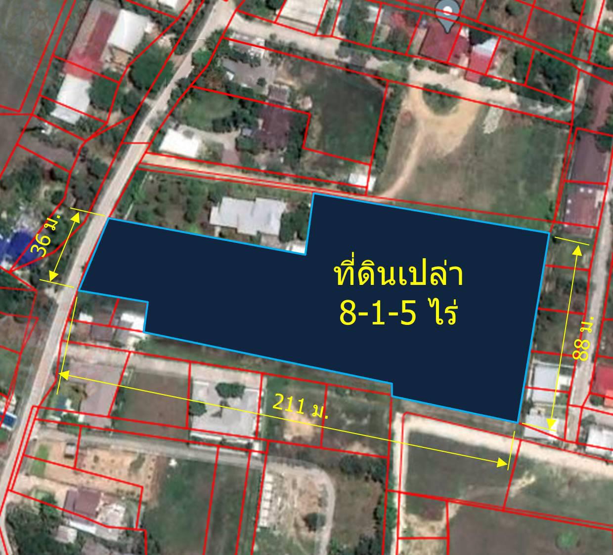 # พื้นที่เป็นสี่หลี่ยม หน้ากว้างติดถนนลาดยาง 36 เมตร ลึก 211 เมตร ด้านหลังกว้าง 88 เมตร