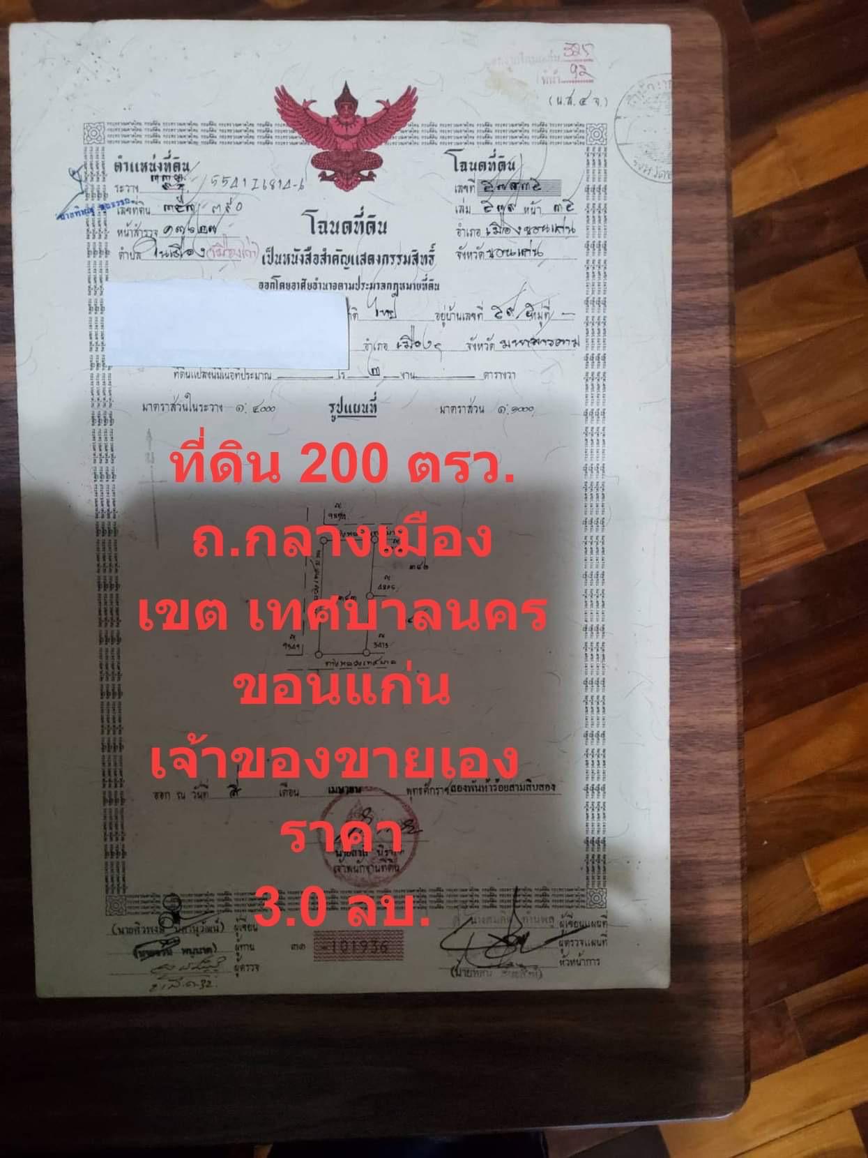ขายที่ดิน 200 ตรว ถ.กลางเมือง ขอนแก่น 3.0 ลบ