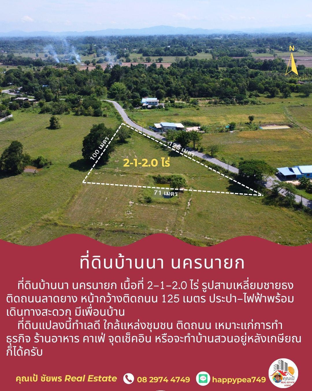 ที่ดินบ้านนา นครนายก เนื้อที่ 2-1-2.0 ไร่ รูปสามเหลี่ยม ชายธง ติดถนนลาดยาง หน้ากว้างติดถนน 125 เมตร ประปา-ไฟฟ้าพร้อม เดินทางสะดวก มีเพื่อนบ้าน