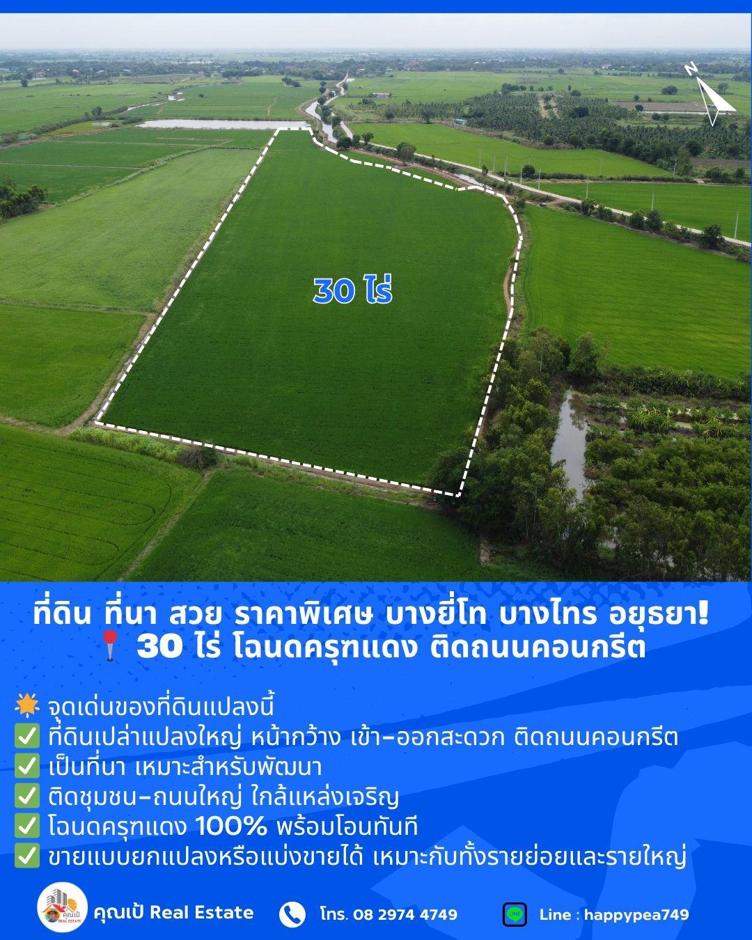 ที่ดิน ที่นา บางไทร อยุธยา! สวย ราคาพิเศษ ขนาด 30 ไร่ โฉนดครุฑแดง ติดถนนคอนกรีต ขายถูกที่สุดในย่านนี้