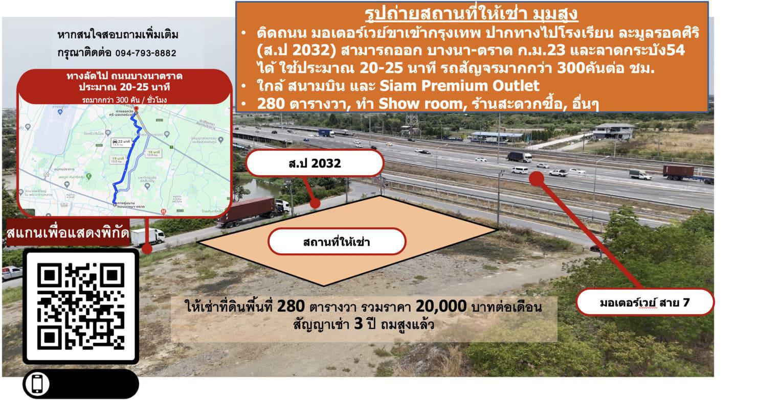 ให้เช่าที่ดินพื้นที่ 280 ตารางวา รวมราคา 20,000 บาทต่อเดือน สัญญาเช่า 3 ปี ถมสูงแล้ว