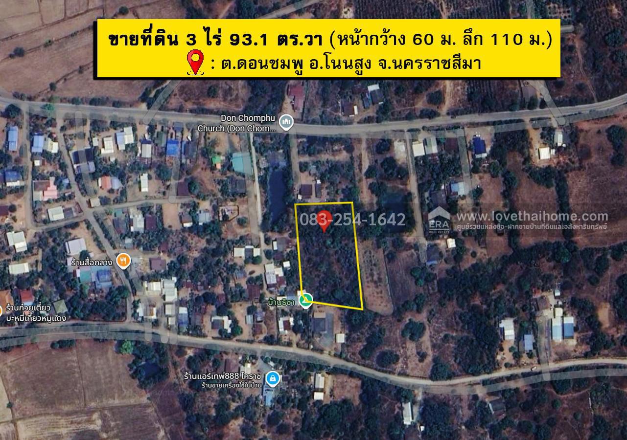 ขายที่ดินเปล่า 3ไร่ 93.1 ตร.วา ต.ดอนชมพู อ.โนนสูง จ.นครราชสีมา ราคา 4.5 ล้าน ที่ดินใกล้ถนนมิตรภาพ ทางเข้าชุมชนดอนชมพู นครราชสีมา ทางเข้าเป็นถนนสาธารณะ (หน้ากว้าง 60 ม. ลึก 110 ม.)