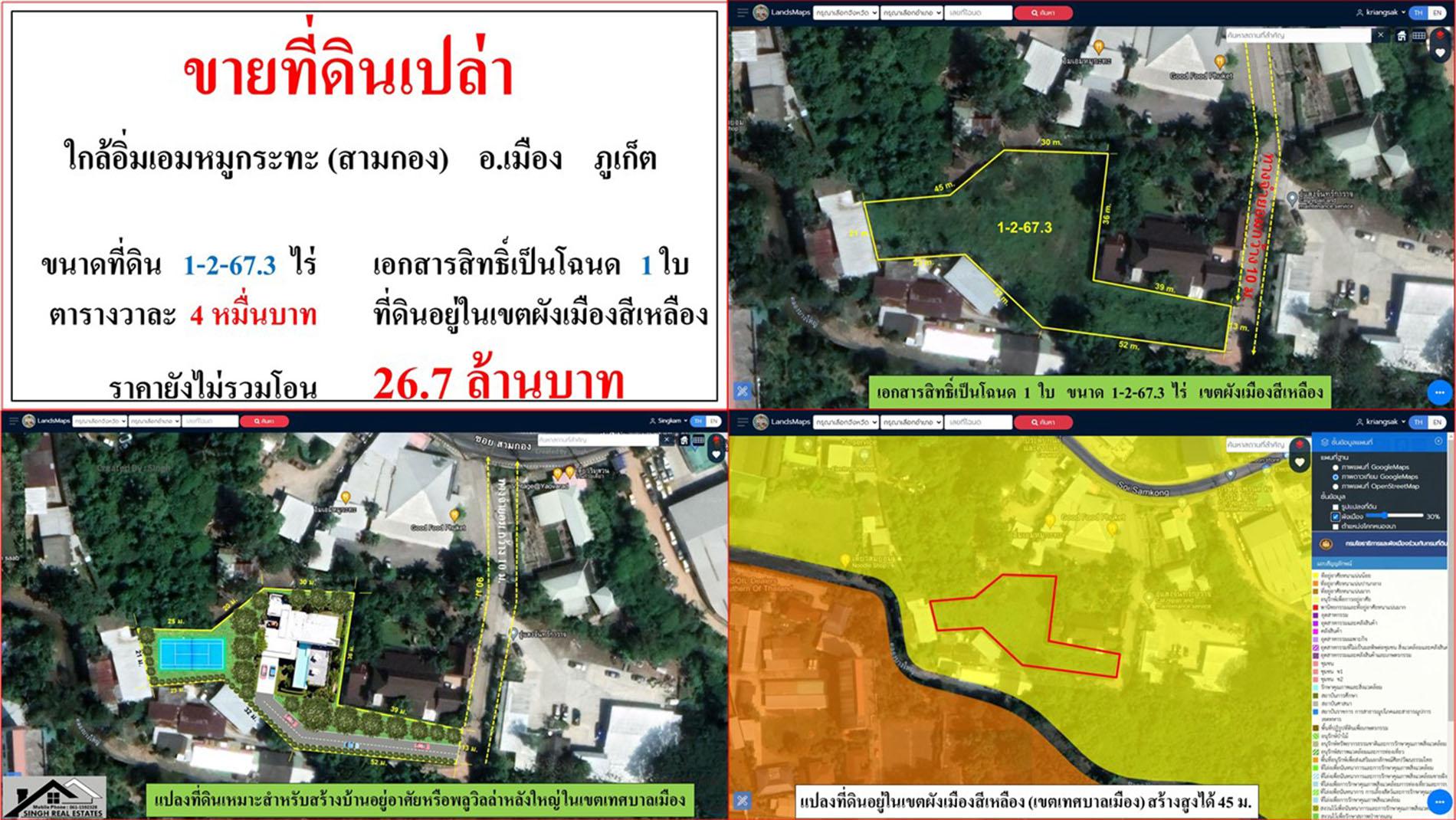 ขายที่ดินเปล่า ขนาด 1-2-67.3 ไร่ ใกล้อิ่มเอมหมูกระทะ(สามกอง) อ.เมือง ภูเก็ต