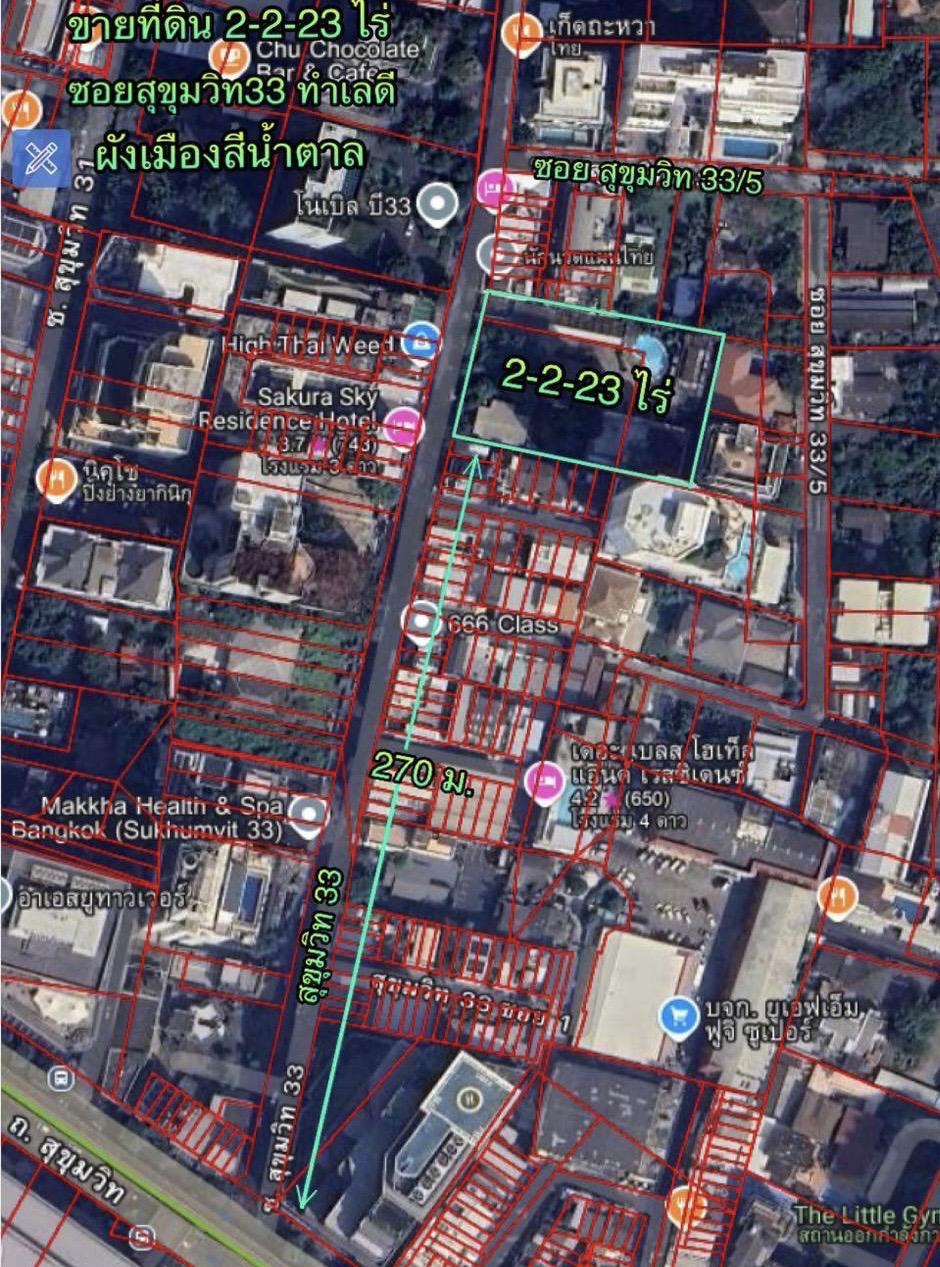 R68-085ขายที่ดิน 2-2-23 ไร่ซอยสุขุมวิท 33 เข้าซอย 270 เมตร ทำเลดี ผังเมืองสีน้ำตาล ถนนซอยกว้าง 12 เมตร ขึ้นอาคารได้30กว่าชั้น