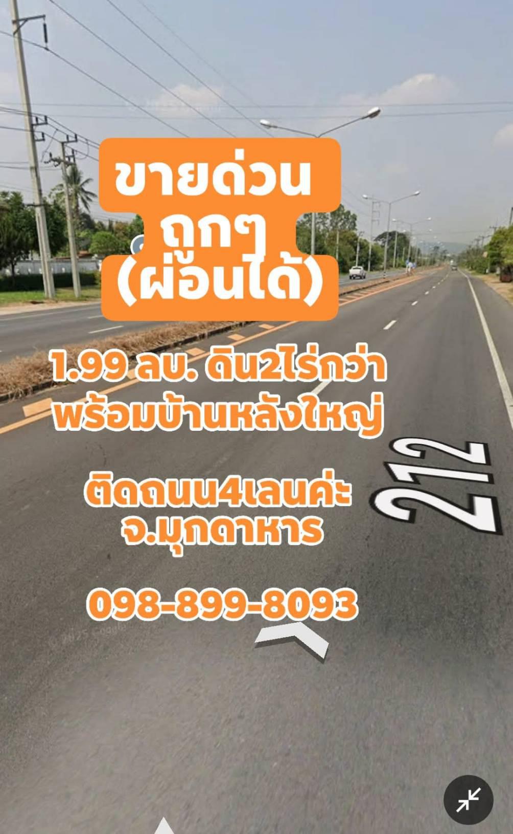 2ไร่ครึ่งกว่าติดถนนใหญ่4เลน ติดโรงงาน มีบ้านหลังใหญ่ให้ด้วยค่ะ ขายแค่1.99ลบ มาเอาไปค่ะ มุกดาหาร รายละเอียด รูป/โฉนด เพิ่มเติมที่ไลน์ได้ค่ะ