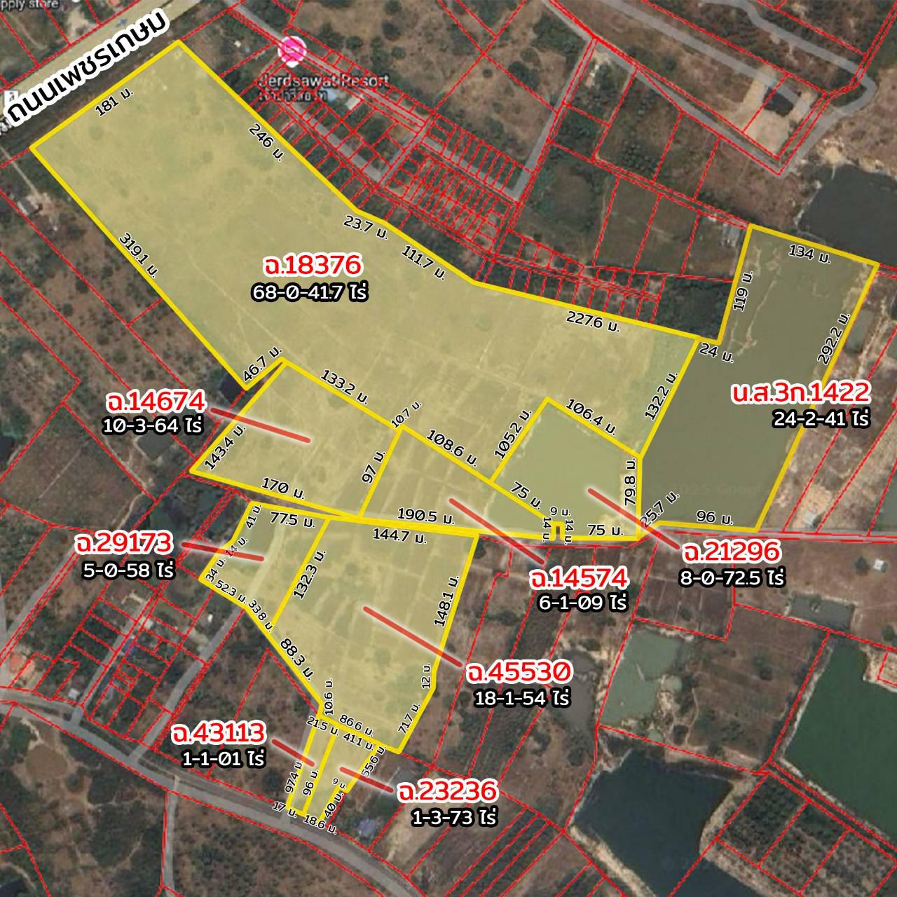• เนื้อที่รวม 144 ไร่ 3 งาน 14.2 ตร.ว. แบ่งเป็นโฉนด 105 ไร่ 2 งาน 91.7 ตร.ว. และ นส3ก. จำนวน 39 ไร่ 22.5 ตร.ว.