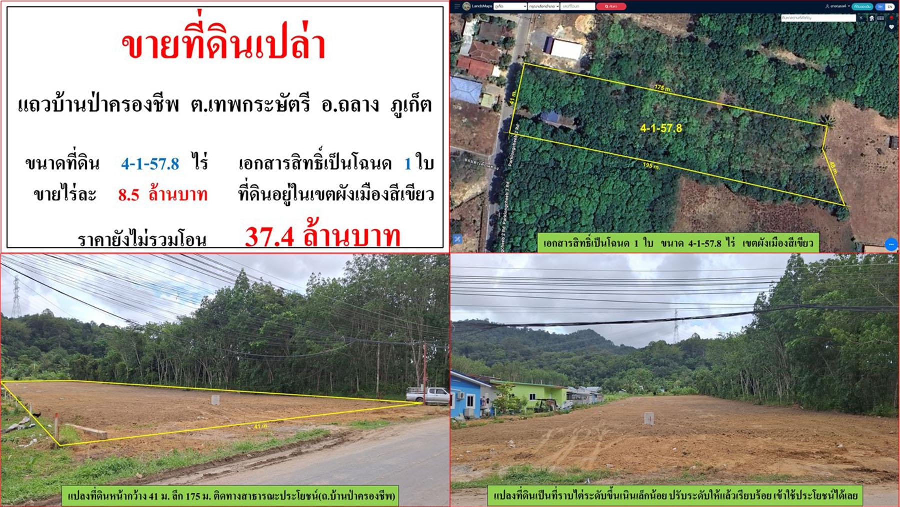 ขายที่ดินเปล่า ขนาด 4-1-57.8 ไร่ แถวบ้านป่าครองชีพ ต.เทพกระษัตรี อ.ถลาง ภูเก็ต