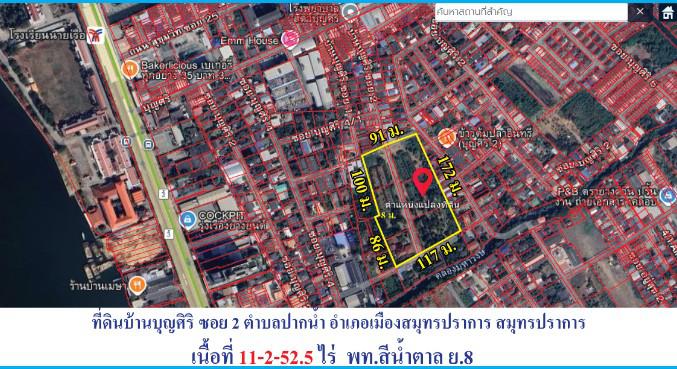 ที่ดินซอยบุญศิริ ซอย.2 ต.ปากน้ำ อ.เมืองสมุทรปราการ จ.สมุทรปราการ เนื้อที่ 11-2-52.2 ไร่ มีทั้งหมด 7 โฉนด ขายแยกหรือรว