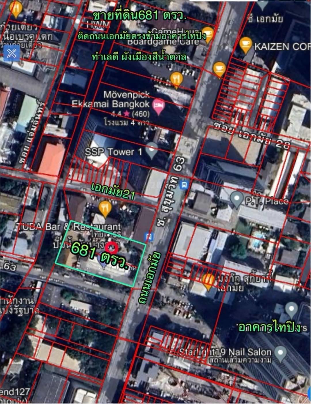 R068-055ขายที่ดิน681ตรว.ติดถนนเอกมัยเยื้องอาคารไทปิงใกล้ซอยเอกมัย21ออกทองหล่อได้ ปัจจุบันปั้มบางจากเช่าอยู่ สัญญาเช่าเหลืออีกประมาณ6ปี ขายพร้อมผู้เช่