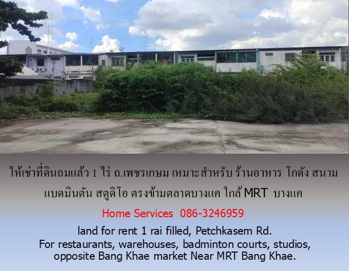 ให้เช่าที่ดินถมแล้ว 1 ไร่ ถ.เพชรเกษม เข้าออกได้ 2 ทาง เหมาะสำหรับ ร้านอาหาร โกดัง สนามแบดมินตัน สตูดิโอ ตรงข้ามตลาดบางแค