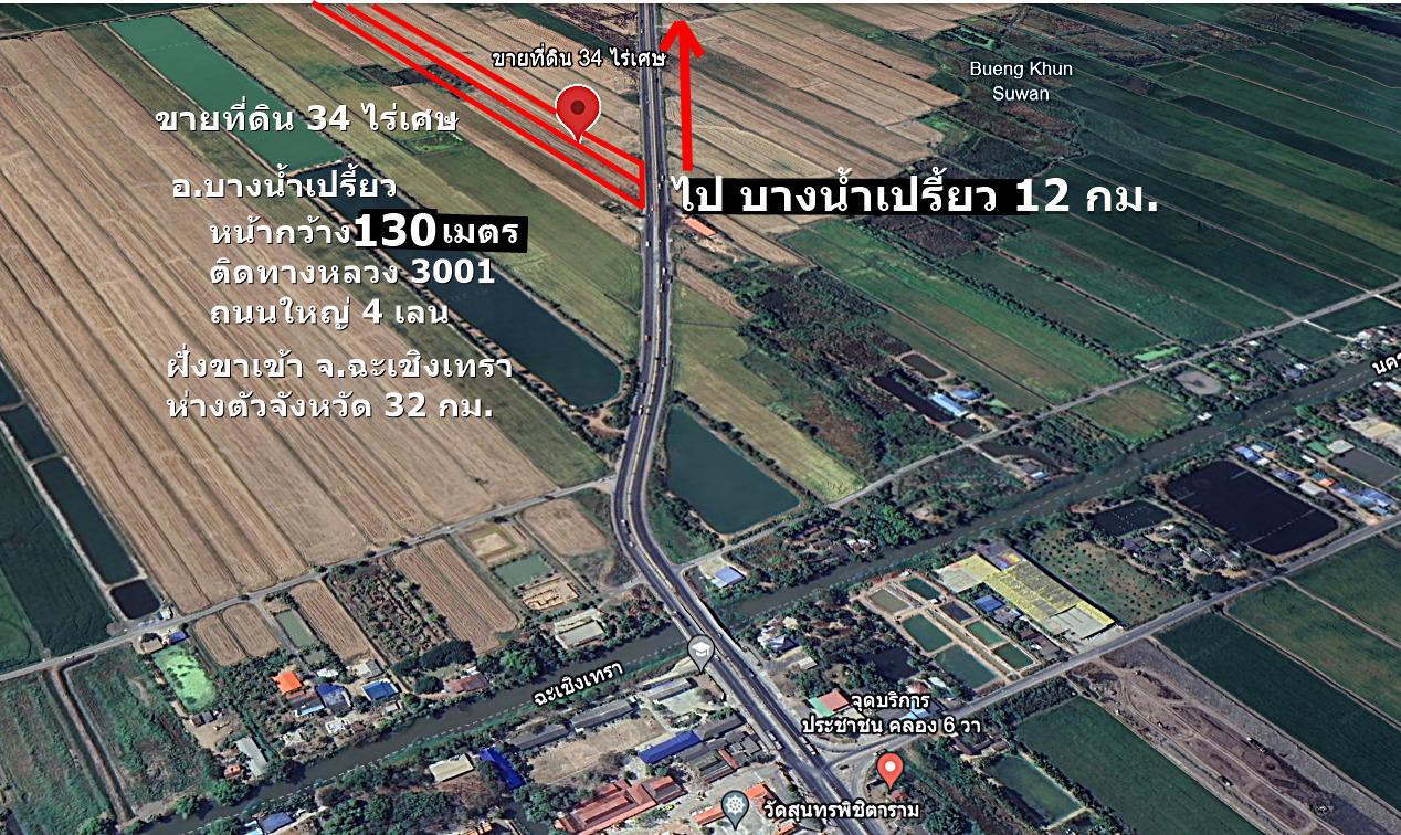 ขายที่ดิน 34 ไร่ หน้ากว้าง 130 เมตร ติดถนนใหญ่ 4 เลน ทางหลวงชนบท 3001 องครักษ์-บางน้ำเปรี้ยว ไร่ละ 2.5 ล้านบาท
