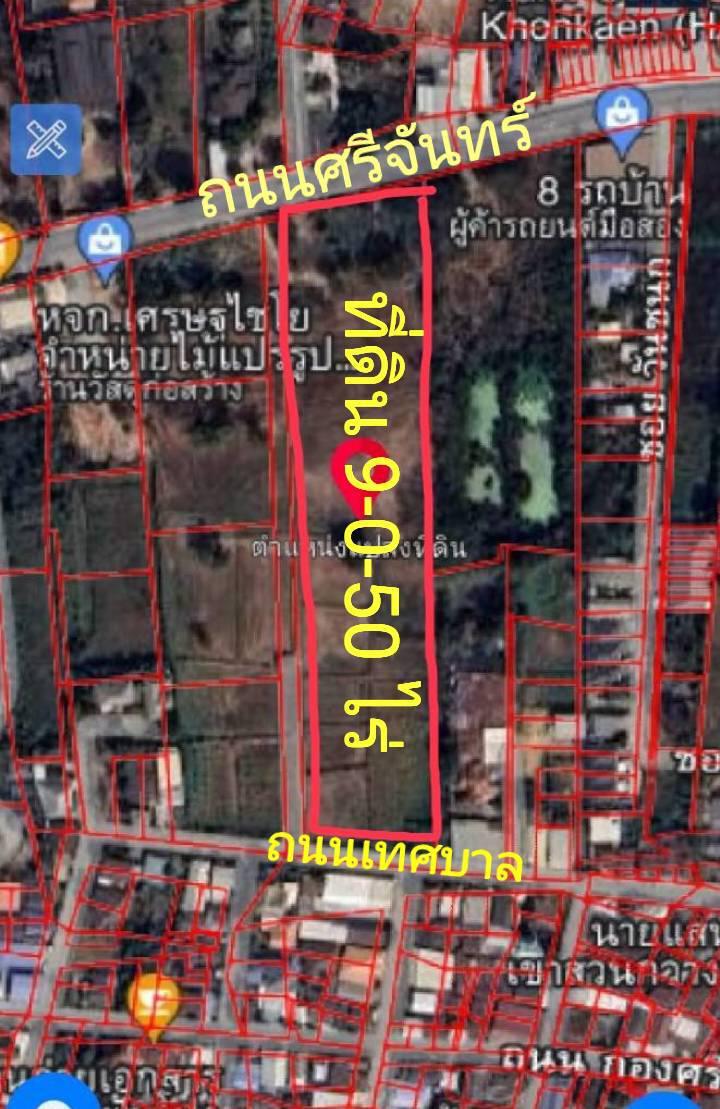 ขายที่ดิน 9-0-50 ไร่ ด้านหน้าติดถนนศรีจันทร์ ด้านหลังติดถนนเทศบาล ต.บ้านเป็ด อ.เมืองขอนแก่น ขายไร่ละ 9.5 ล้าน