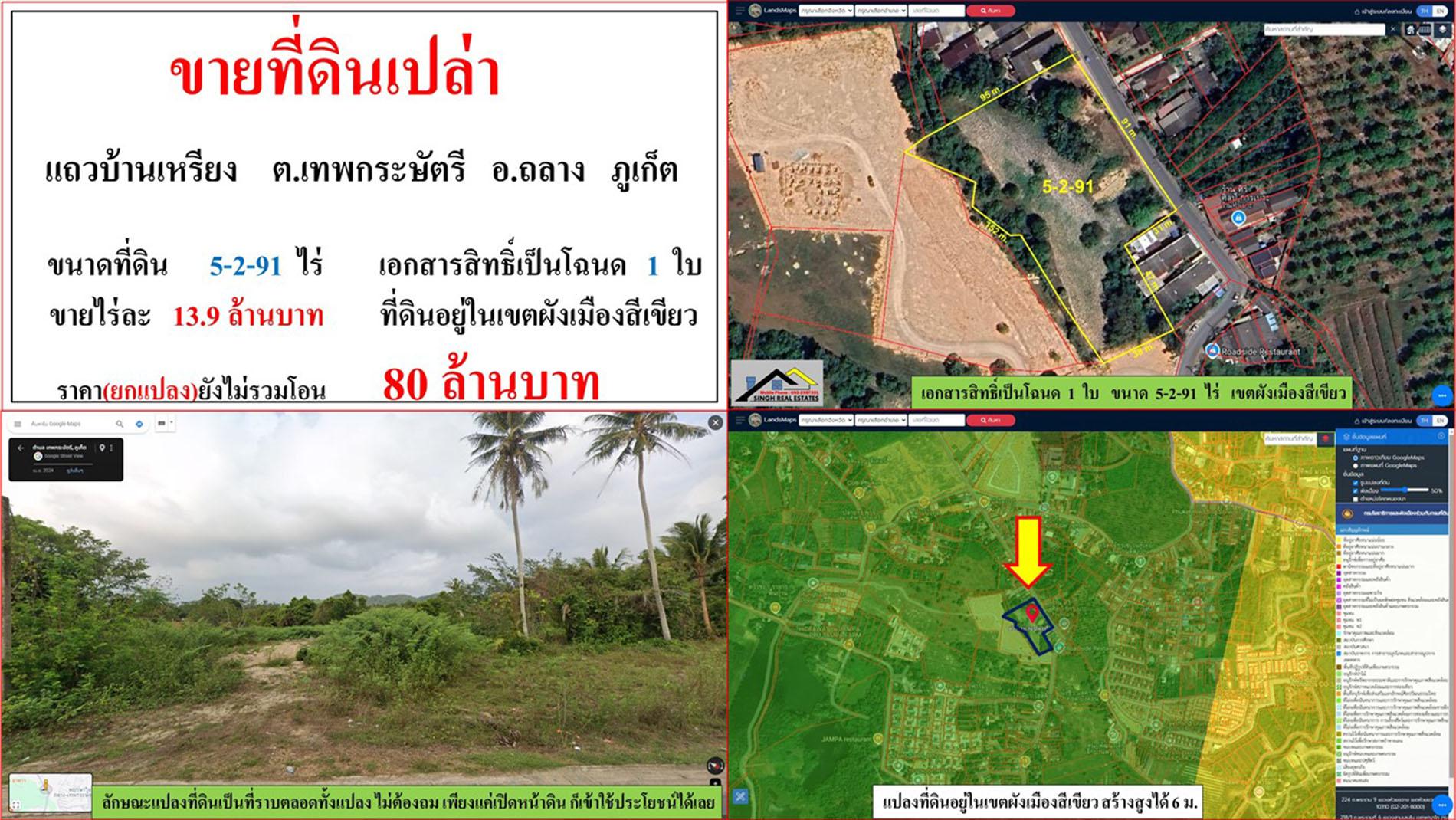 ขายที่ดินเปล่า ขนาด 5-2-91 ไร่ แถวบ้านเหรียง ต.เทพกระษัตรี อ.ถลาง ภูเก็ต