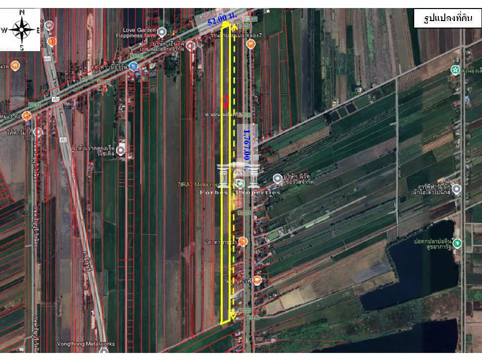 เนื้อที่ 49-2-08 ไร่ ด้านติดถนนกว้าง 52 เมตร ลึก 1,767 เมตร ถนนด้านหน้าที่ดินกว้าง 8 เมตร ถนนสาธารณะ พื้นที่สีชมพู